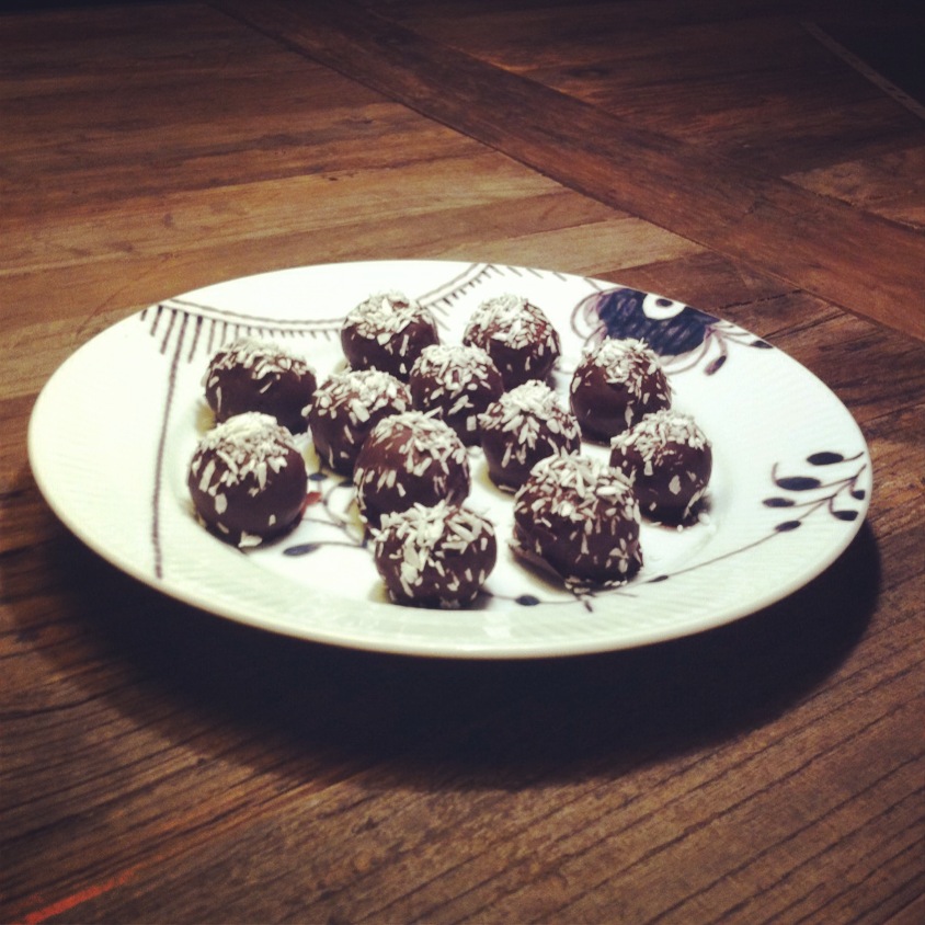 - Smelt chokoladen (i mikroovnen) – og dyp herefter kuglerne i den smeltede chokolade.