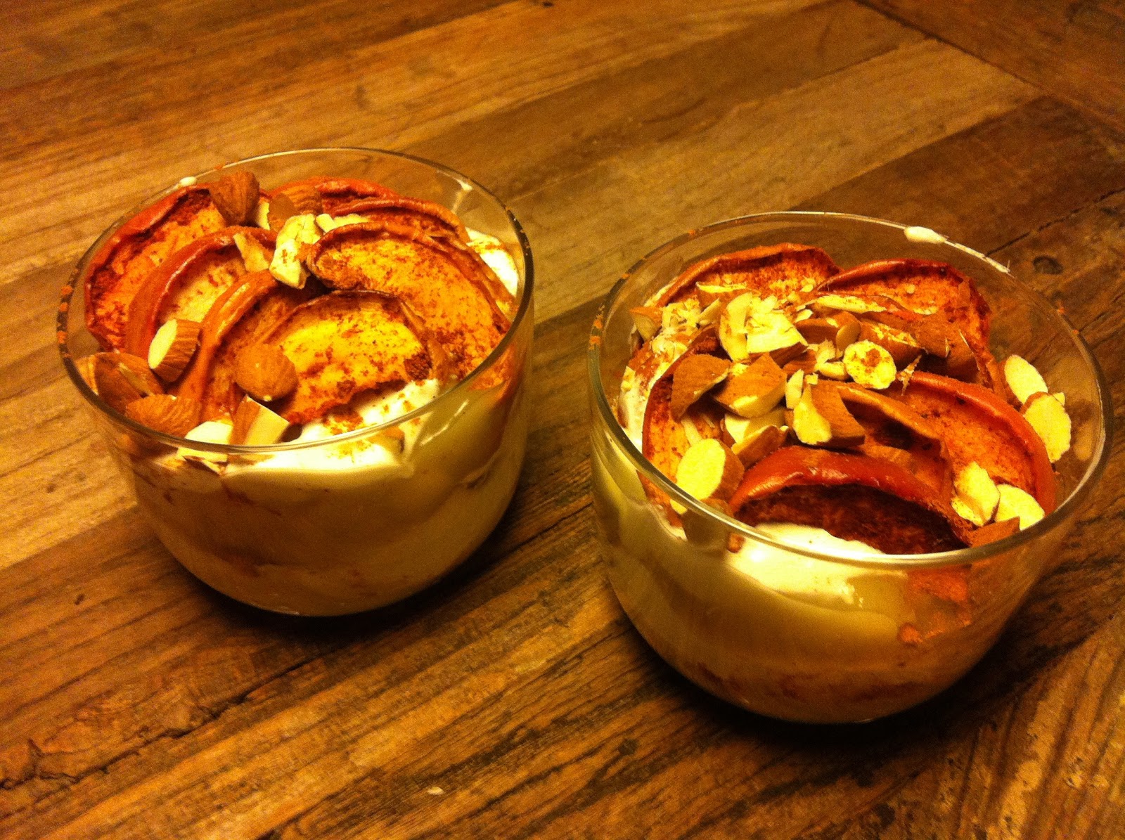 Tænk ovnen pÃ¥ 175 grader. Skær herefter æblerne i fine bÃ¥de. Kom æblerne i et ildfast fad, drys med kanel, og div dem et sted mellem 30-45 minutter i ovnen. NÃ¥r æblerne er færdige, kan du begynde at lave “kagen”. Det har ingen betydning, hvilken rækkefølge du laver lagene, men jeg gjorde pÃ¥ følgende mÃ¥de: et lag  æblegrød, et lag skyr og et lag med ovnbagte æbler – drys eventuelt med lidt ekstra kanel. Gentag rækkefølgen, sÃ¥ du samlet set fÃ¥r seks lag i kagen. Top eventuelt med hakkede mandler.