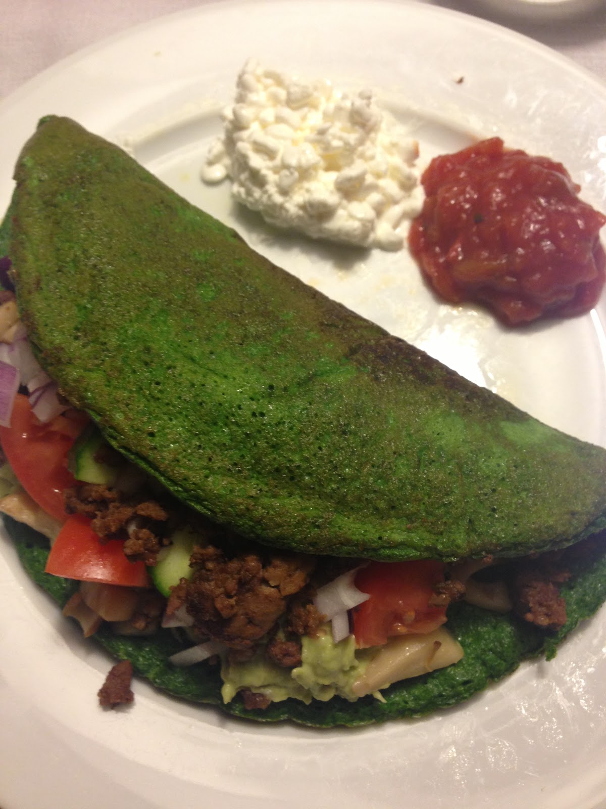 Jeg er dog ikke den største brødspiser, og dermed heller ikke den største fan af tortillas. Jeg besluttede mig derfor for at prøve at lave nogle spinat “tortillas”, som ikke indeholdte mel eller lign. Min idé var at lave en tynd tortilla pandekage, som nemt kunne rulles omkring tilbehøret. “Pandekagedejen” lavede jeg af 1 æg og 2 hvider, lidt mælk – og så tilførte jeg en håndfuld friske spinatbalde. Ingredienserne kom jeg derefter i blenderen, hvorefter jeg havde en “pandekagemasse”.